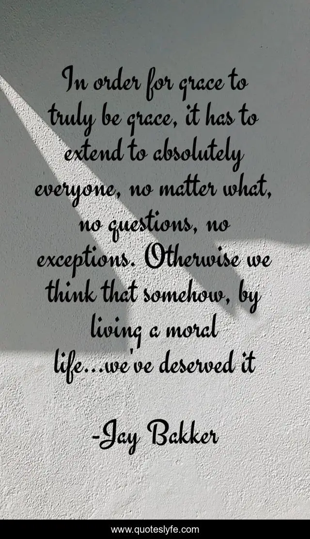 This page presents the quote "In order for grace to truly be grace, it has to extend to absolutely everyone, no matter what, no questions, no exceptions. Otherwise we think that somehow, by living a moral life...we've deserved it". Author of this quote is Jay Bakker. .