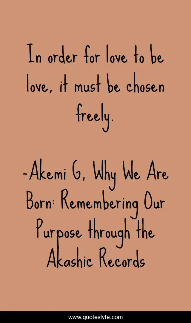 This page presents the quote "In order for love to be love, it must be chosen freely.". Author of this quote is Akemi G, Why We Are Born: Remembering Our Purpose through the Akashic Records. .