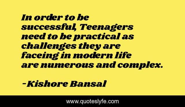 This page presents the quote "In order to be successful, Teenagers need to be practical as challenges they are faceing in modern life are numerous and complex.". Author of this quote is Kishore Bansal. This quote is about challenges, practical, teenagers, successful,.