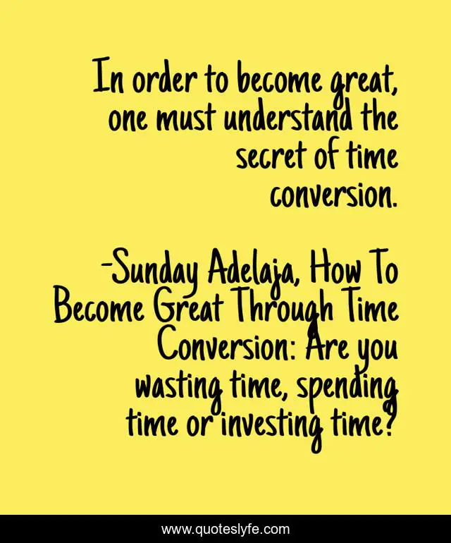 This page presents the quote "In order to become great, one must understand the secret of time conversion.". Author of this quote is Sunday Adelaja, How To Become Great Through Time Conversion: Are you wasting time, spending time or investing time?. This quote is about life, conversion, productivity, wealth, secret, greatness, waste, humanity, product,.