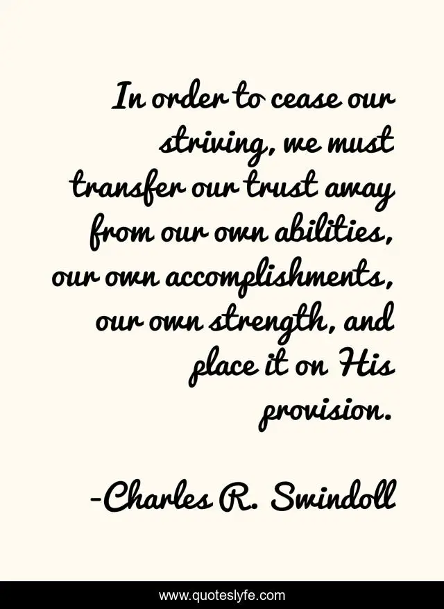 This page presents the quote "In order to cease our striving, we must transfer our trust away from our own abilities, our own accomplishments, our own strength, and place it on His provision.". Author of this quote is Charles R. Swindoll. This quote is about god-s-provision, christianity,.