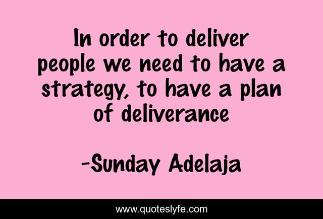 This page presents the quote "In order to deliver people we need to have a strategy, to have a plan of deliverance". Author of this quote is Sunday Adelaja. This quote is about people, deliver, strategy, deliverance, order, plan,.