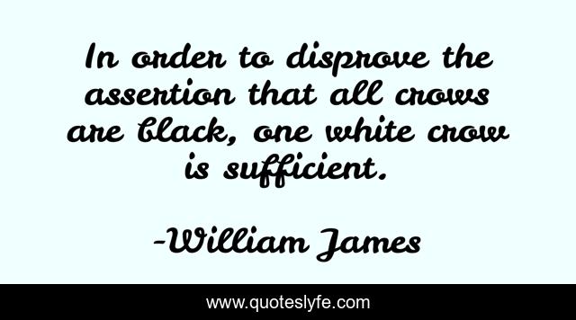 This page presents the quote "In order to disprove the assertion that all crows are black, one white crow is sufficient.". Author of this quote is William James. This quote is about theory, religion, science, spirituality, harvard-professor-of-psychology, proof,.