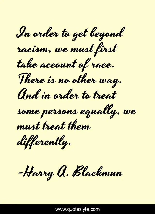 This page presents the quote "In order to get beyond racism, we must first take account of race. There is no other way. And in order to treat some persons equally, we must treat them differently.". Author of this quote is Harry A. Blackmun. This quote is about racism, way, treat,.