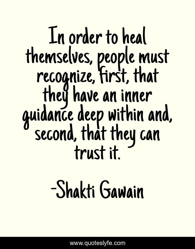 This page presents the quote "In order to heal themselves, people must recognize, first, that they have an inner guidance deep within and, second, that they can trust it.". Author of this quote is Shakti Gawain. This quote is about inner-voice, healing, intuition,.