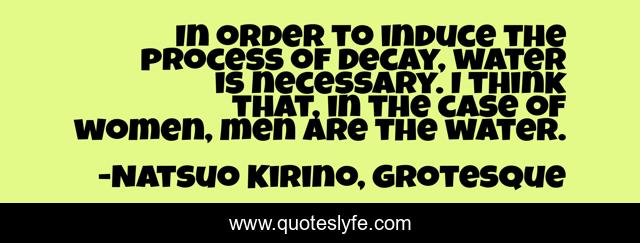 This page presents the quote "In order to induce the process of decay, water is necessary. I think that, in the case of women, men are the water.". Author of this quote is Natsuo Kirino, Grotesque. This quote is about decay, grotesque, women,.