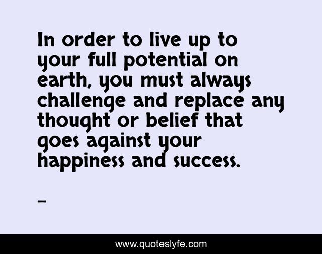 This page presents the quote "In order to live up to your full potential on earth, you must always challenge and replace any thought or belief that goes against your happiness and success.". Author of this quote is . This quote is about happiness-and-success, belief, edmond-mbiaka, thought, live-up-to-your-true-potential, beliefs,.