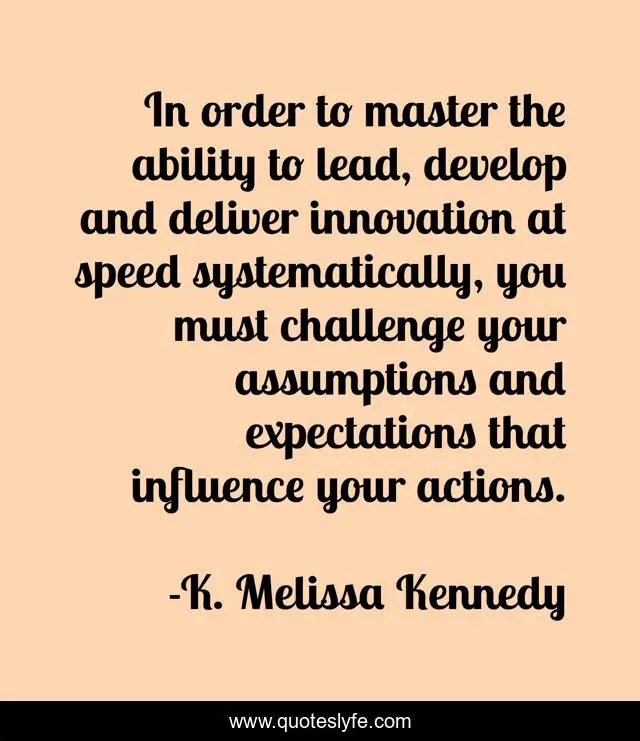 This page presents the quote "In order to master the ability to lead, develop and deliver innovation at speed systematically, you must challenge your assumptions and expectations that influence your actions.". Author of this quote is K. Melissa Kennedy. This quote is about leadership, innovation,.