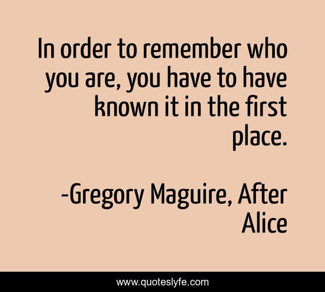 This page presents the quote "In order to remember who you are, you have to have known it in the first place.". Author of this quote is Gregory Maguire, After Alice. This quote is about being, sense-of-self,.