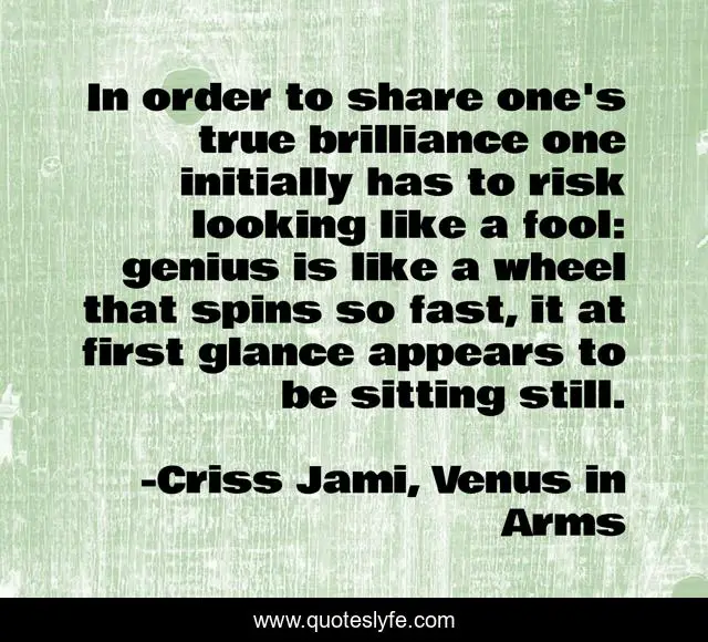 In order to share one's true brilliance one initially has to risk looking like a fool: genius is like a wheel that spins so fast, it at first glance appears to be sitting still.