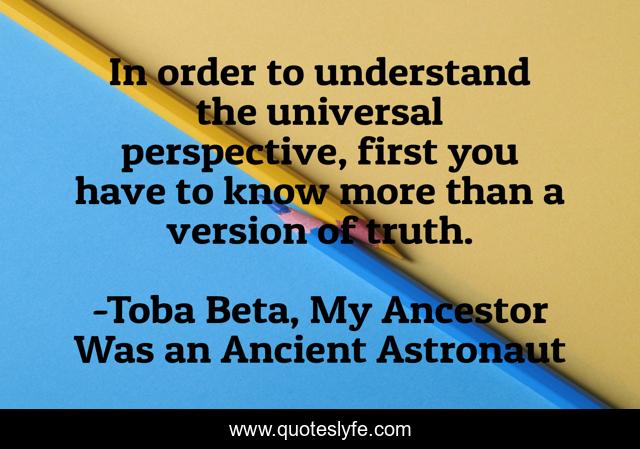 This page presents the quote "In order to understand the universal perspective, first you have to know more than a version of truth.". Author of this quote is Toba Beta, My Ancestor Was an Ancient Astronaut. This quote is about many, truth, universal-perspective,.