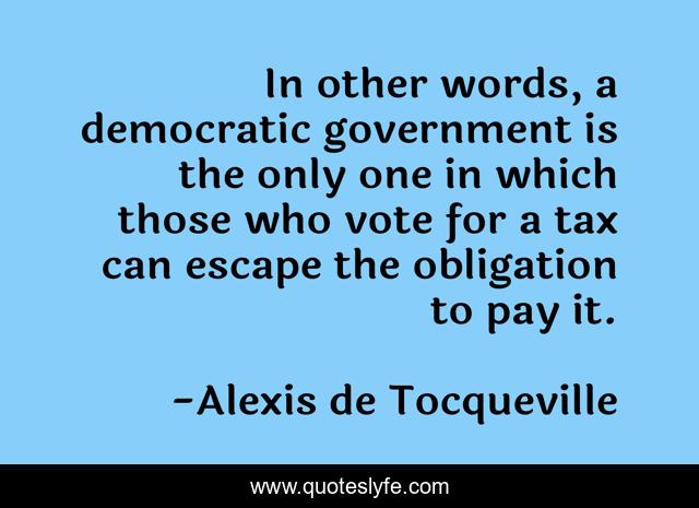 This page presents the quote "In other words, a democratic government is the only one in which those who vote for a tax can escape the obligation to pay it.". Author of this quote is Alexis de Tocqueville. This quote is about vote, words, escape,.