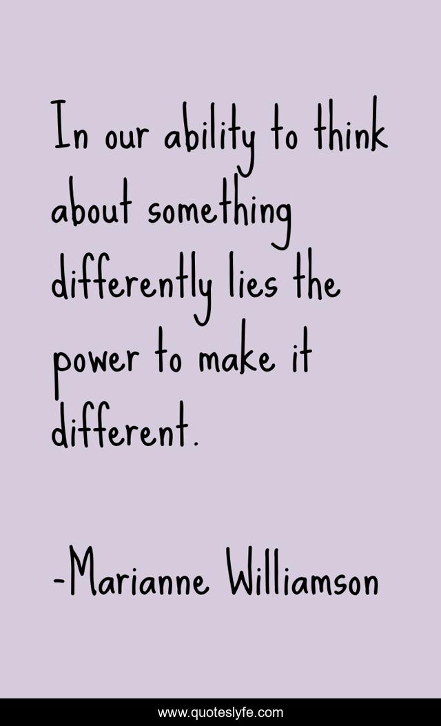 This page presents the quote "In our ability to think about something differently lies the power to make it different.". Author of this quote is Marianne Williamson. This quote is about action, different-perspective, inspiration,.