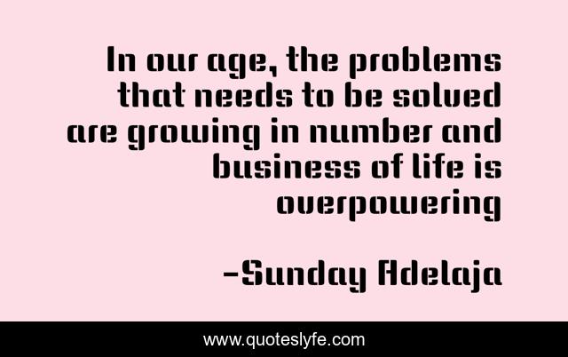 This page presents the quote "In our age, the problems that needs to be solved are growing in number and business of life is overpowering". Author of this quote is Sunday Adelaja. This quote is about life, business, people, age, problems, nation, overpower, society, world,.
