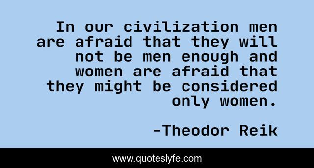 This page presents the quote "In our civilization men are afraid that they will not be men enough and women are afraid that they might be considered only women.". Author of this quote is Theodor Reik. This quote is about men, women,.