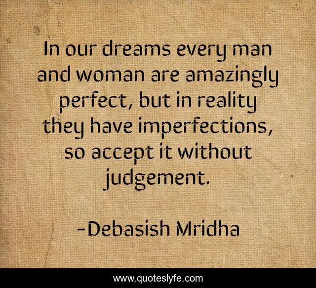 This page presents the quote "In our dreams every man and woman are amazingly perfect, but in reality they have imperfections, so accept it without judgement.". Author of this quote is Debasish Mridha. This quote is about perfect, life, woman, love, knowledge, inspirational, intelligence, philosophy, education,.