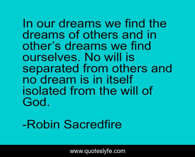 This page presents the quote "In our dreams we find the dreams of others and in other’s dreams we find ourselves. No will is separated from others and no dream is in itself isolated from the will of God.". Author of this quote is Robin Sacredfire. This quote is about spiritual, yoga, love, god, spirituality, hinduism, affection,.