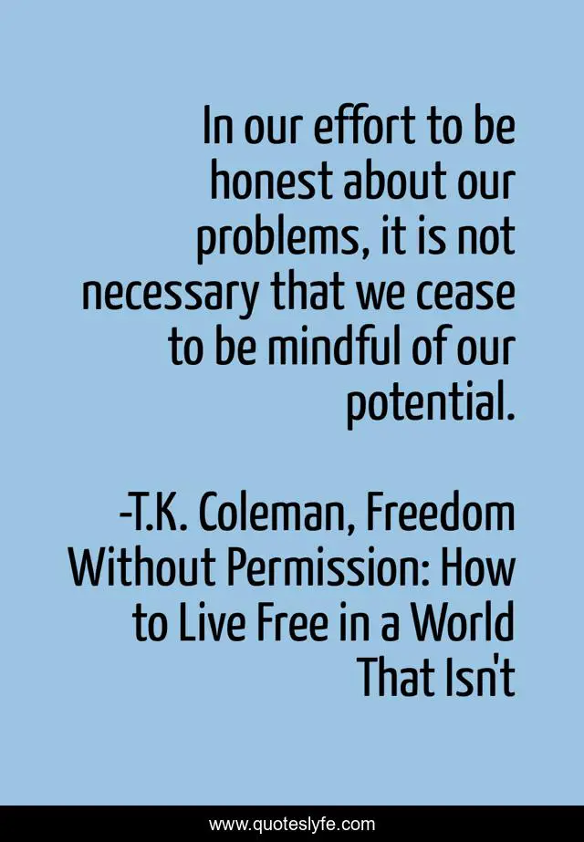 This page presents the quote "In our effort to be honest about our problems, it is not necessary that we cease to be mindful of our potential.". Author of this quote is T.K. Coleman, Freedom Without Permission: How to Live Free in a World That Isn't. This quote is about optimism, problems, honesty, realism, staying-positive,.