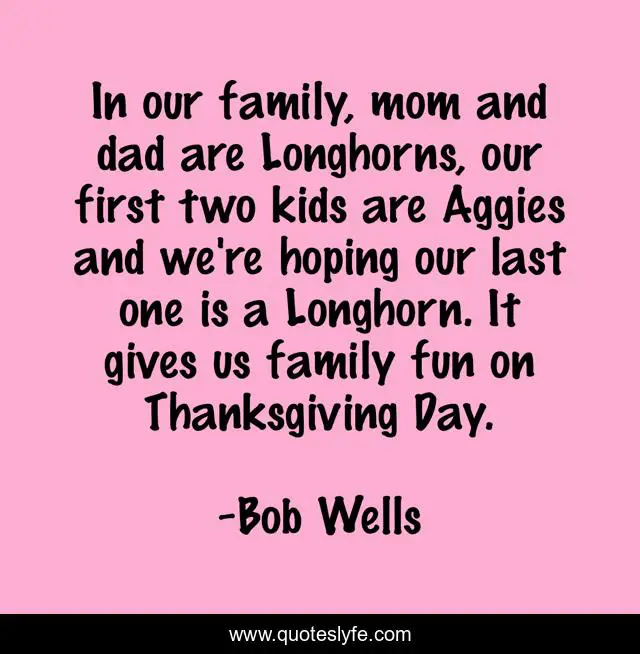 This page presents the quote "In our family, mom and dad are Longhorns, our first two kids are Aggies and we're hoping our last one is a Longhorn. It gives us family fun on Thanksgiving Day.". Author of this quote is Bob Wells. This quote is about family, day, mom,.