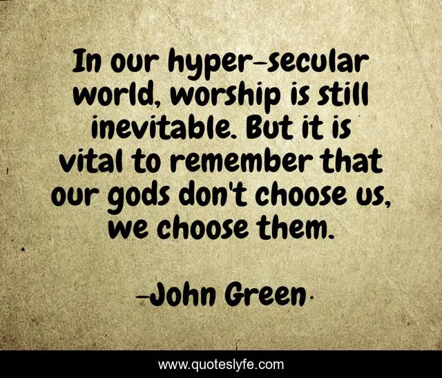 This page presents the quote "In our hyper-secular world, worship is still inevitable. But it is vital to remember that our gods don't choose us, we choose them.". Author of this quote is John Green. This quote is about religion, heroes, inspirational, enthusiasm,.