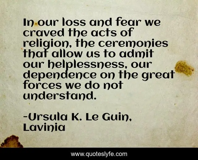 This page presents the quote "In our loss and fear we craved the acts of religion, the ceremonies that allow us to admit our helplessness, our dependence on the great forces we do not understand.". Author of this quote is Ursula K. Le Guin, Lavinia. This quote is about loss, fear, helplessness, religion,.