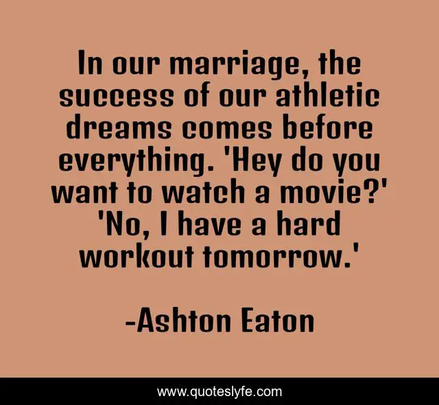 This page presents the quote "In our marriage, the success of our athletic dreams comes before everything. 'Hey do you want to watch a movie?' 'No, I have a hard workout tomorrow.'". Author of this quote is Ashton Eaton. This quote is about marriage, tomorrow, success,.