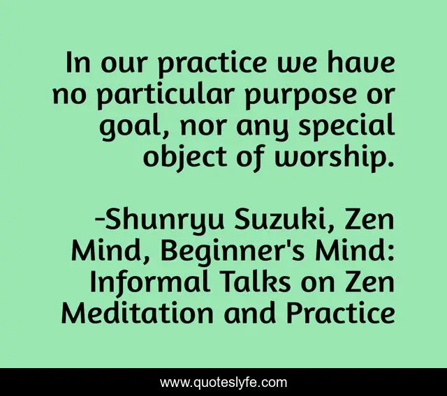 This page presents the quote "In our practice we have no particular purpose or goal, nor any special object of worship.". Author of this quote is Shunryu Suzuki, Zen Mind, Beginner's Mind: Informal Talks on Zen Meditation and Practice. .
