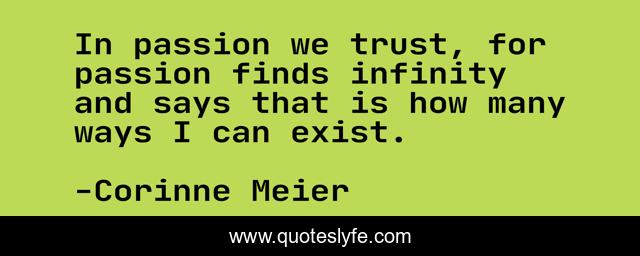 This page presents the quote "In passion we trust, for passion finds infinity and says that is how many ways I can exist.". Author of this quote is Corinne Meier. This quote is about imagination, trust, creation,.