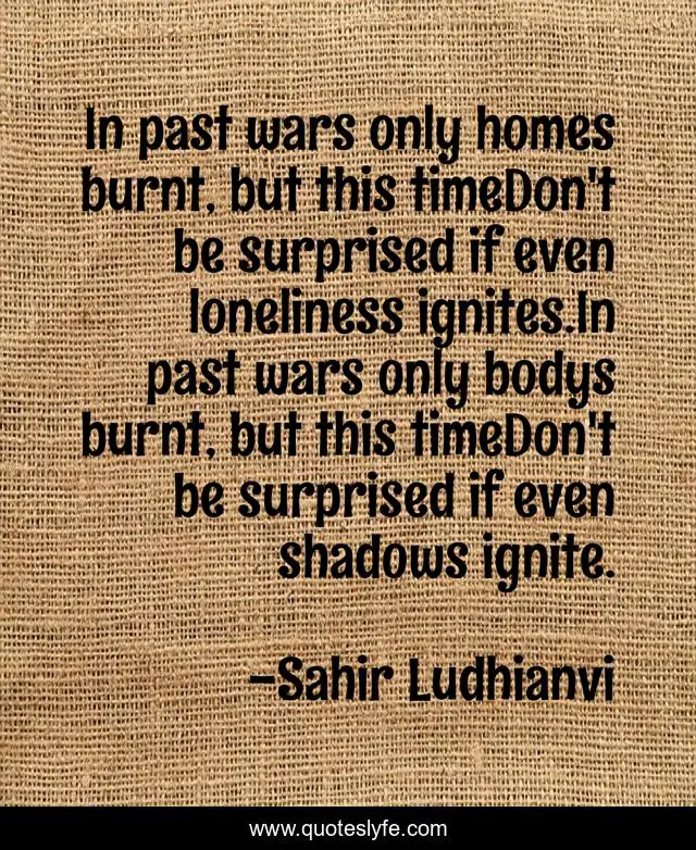 This page presents the quote "In past wars only homes burnt, but this timeDon't be surprised if even loneliness ignites.In past wars only bodys burnt, but this timeDon't be surprised if even shadows ignite.". Author of this quote is Sahir Ludhianvi. This quote is about ignite, poem, nagasaki, burning, home, surprise, poetry, quotes, sadness,.