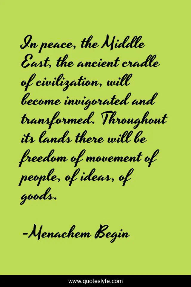 This page presents the quote "In peace, the Middle East, the ancient cradle of civilization, will become invigorated and transformed. Throughout its lands there will be freedom of movement of people, of ideas, of goods.". Author of this quote is Menachem Begin. This quote is about freedom, ideas, people,.