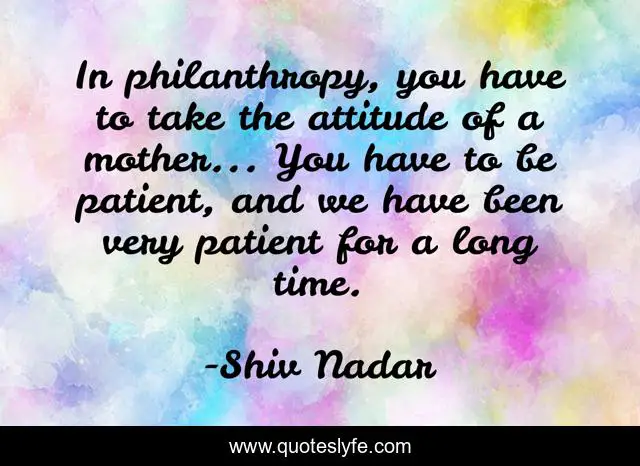 This page presents the quote "In philanthropy, you have to take the attitude of a mother... You have to be patient, and we have been very patient for a long time.". Author of this quote is Shiv Nadar. This quote is about time, long, mother,.