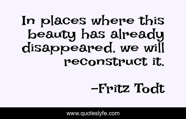 This page presents the quote "In places where this beauty has already disappeared, we will reconstruct it.". Author of this quote is Fritz Todt. This quote is about environmental, places,.