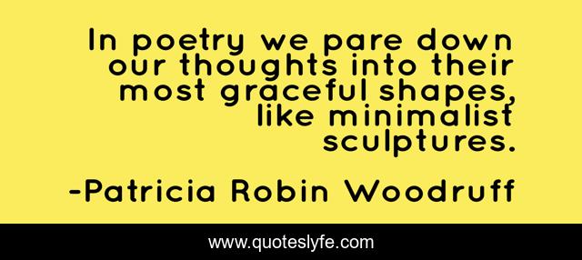 This page presents the quote "In poetry we pare down our thoughts into their most graceful shapes, like minimalist sculptures.". Author of this quote is Patricia Robin Woodruff. This quote is about sculpting-poetry, creation, patricia-robin-woodruff, poetry, writing, quotes, sculpture,.