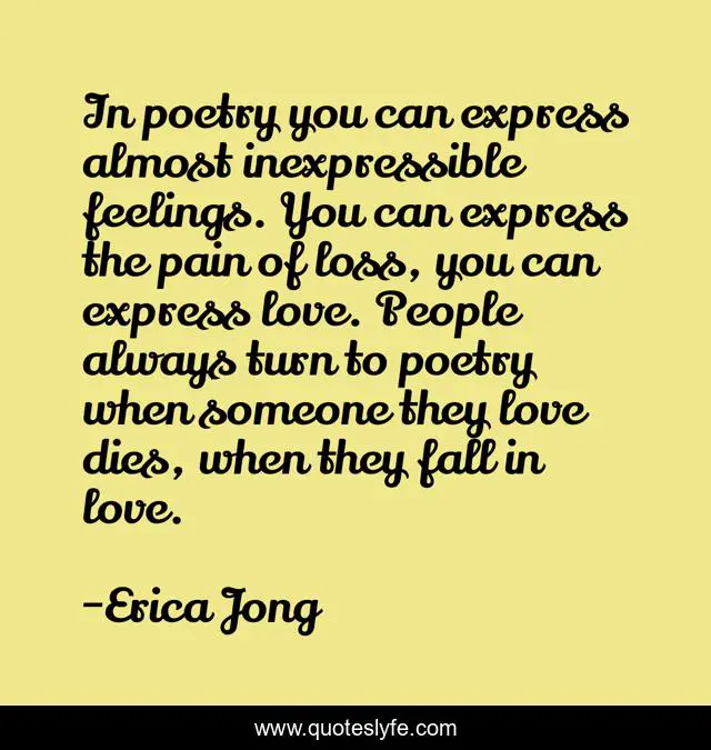 This page presents the quote "In poetry you can express almost inexpressible feelings. You can express the pain of loss, you can express love. People always turn to poetry when someone they love dies, when they fall in love.". Author of this quote is Erica Jong. This quote is about love, pain, affection, fall,.
