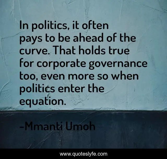 This page presents the quote "In politics, it often pays to be ahead of the curve. That holds true for corporate governance too, even more so when politics enter the equation.". Author of this quote is Mmanti Umoh. This quote is about curve, africa, governance, leadership, politics, corporate,.