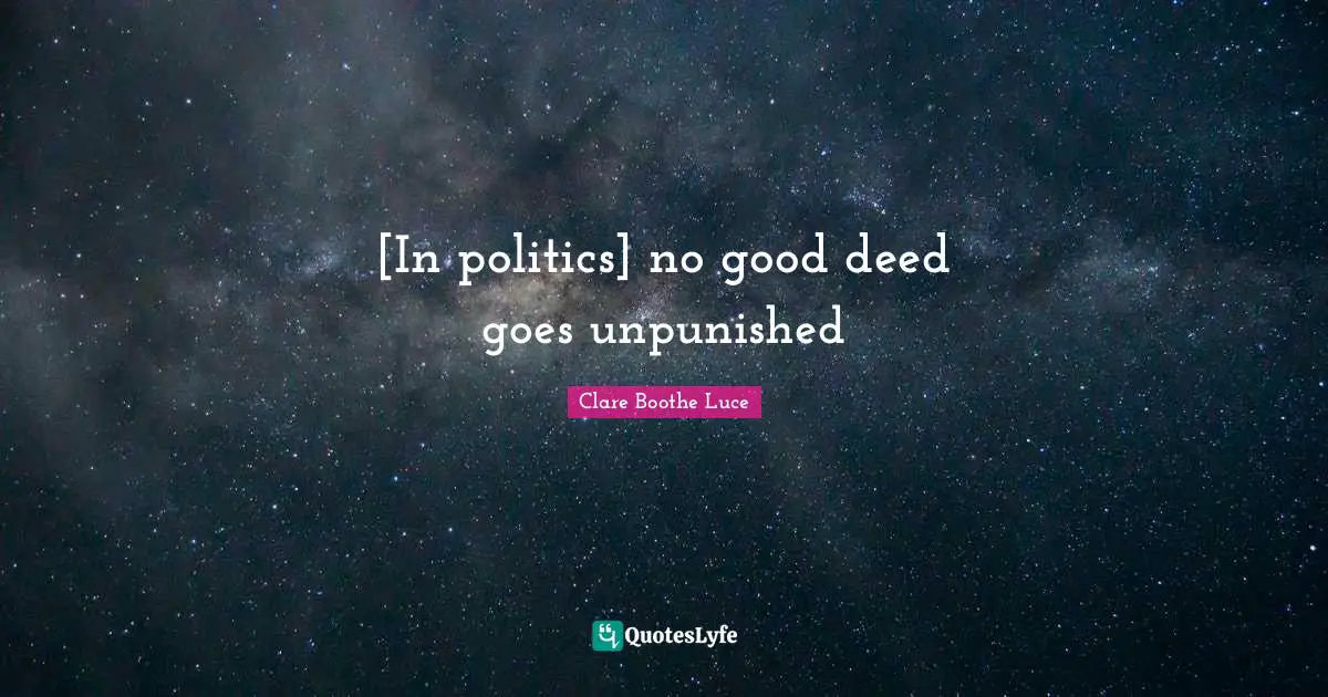 "Clare Boothe Luce Quotes." Quoteslyfe.com, 2026. Fri. 02 Jan. 2026. <https://www.quoteslyfe.com/quote/In-politics-no-good-deed-goes-unpunished-475074>.
