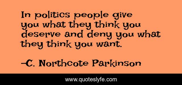 This page presents the quote "In politics people give you what they think you deserve and deny you what they think you want.". Author of this quote is C. Northcote Parkinson. This quote is about think, people,.