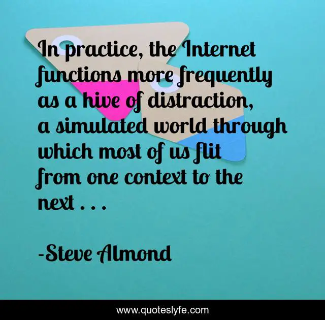 This page presents the quote "In practice, the Internet functions more frequently as a hive of distraction, a simulated world through which most of us flit from one context to the next . . .". Author of this quote is Steve Almond. .