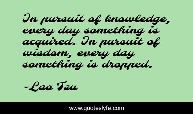 This page presents the quote "In pursuit of knowledge, every day something is acquired. In pursuit of wisdom, every day something is dropped.". Author of this quote is Lao Tzu. This quote is about pursuit, knowledge, wisdom,.
