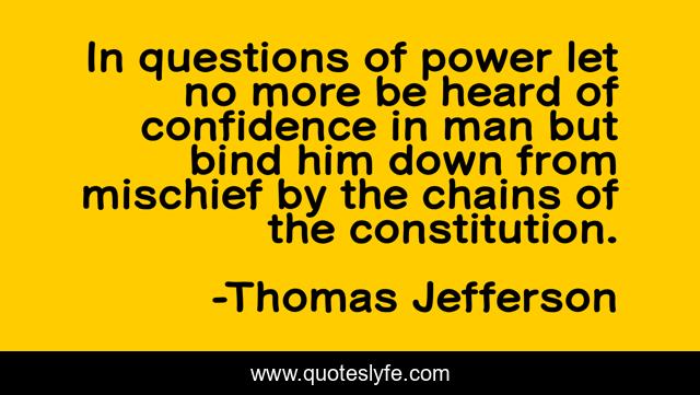 This page presents the quote "In questions of power let no more be heard of confidence in man but bind him down from mischief by the chains of the constitution.". Author of this quote is Thomas Jefferson. .