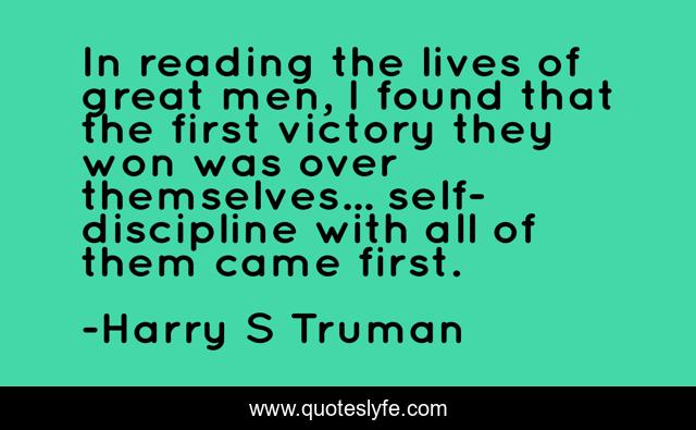 This page presents the quote "In reading the lives of great men, I found that the first victory they won was over themselves... self-discipline with all of them came first.". Author of this quote is Harry S Truman. This quote is about men, reading, victory,.