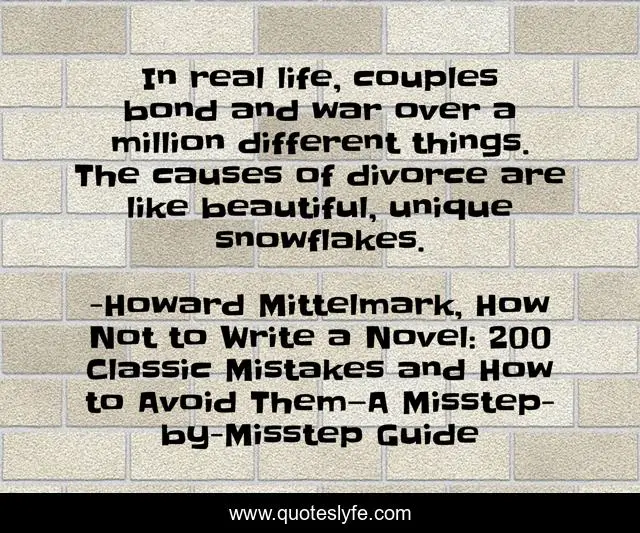 This page presents the quote "In real life, couples bond and war over a million different things. The causes of divorce are like beautiful, unique snowflakes.". Author of this quote is Howard Mittelmark, How Not to Write a Novel: 200 Classic Mistakes and How to Avoid Them—A Misstep-by-Misstep Guide. This quote is about relationships, funny, love, divorce, writing, marriage, comedy, affection,.