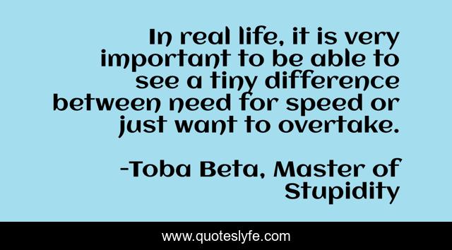 This page presents the quote "In real life, it is very important to be able to see a tiny difference between need for speed or just want to overtake.". Author of this quote is Toba Beta, Master of Stupidity. This quote is about real, life, overtake, need-for-speed, competition,.
