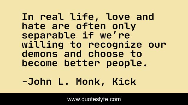 This page presents the quote "In real life, love and hate are often only separable if we’re willing to recognize our demons and choose to become better people.". Author of this quote is John L. Monk, Kick. This quote is about hate, life, love, demons, affection,.