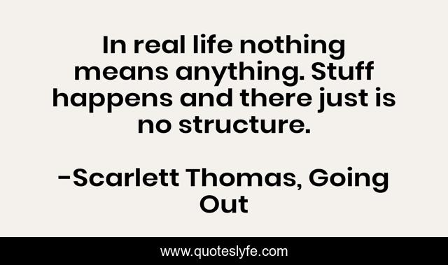 This page presents the quote "In real life nothing means anything. Stuff happens and there just is no structure.". Author of this quote is Scarlett Thomas, Going Out. This quote is about structure, reality,.