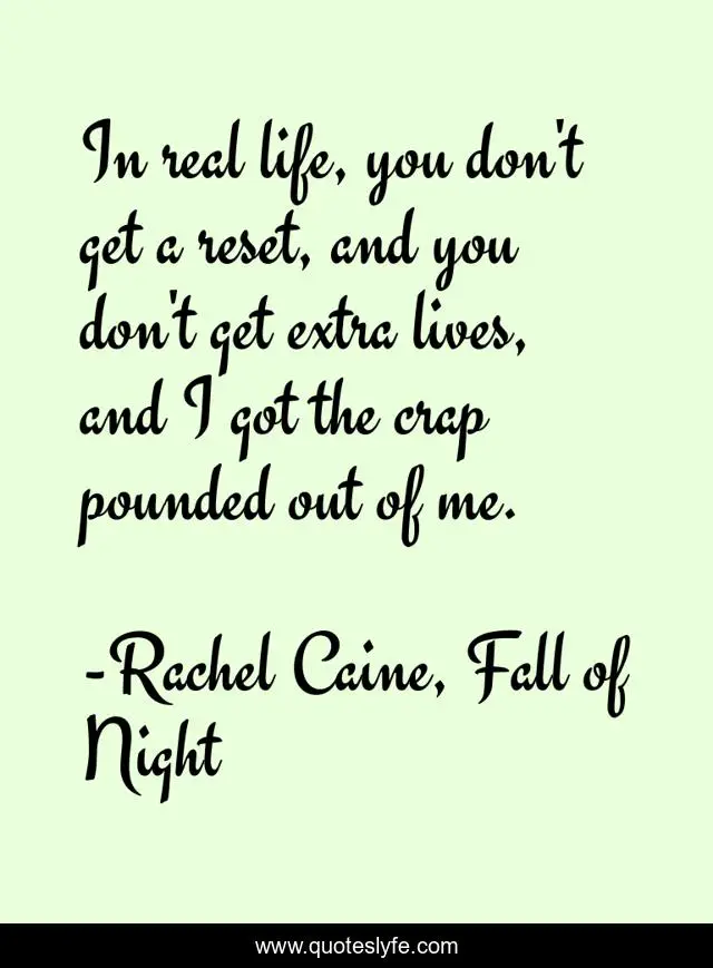 This page presents the quote "In real life, you don't get a reset, and you don't get extra lives, and I got the crap pounded out of me.". Author of this quote is Rachel Caine, Fall of Night. This quote is about video-games, shane-collins, morganville-vampires, violence, reality, real-life,.