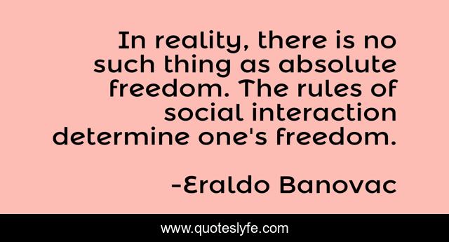 This page presents the quote "In reality, there is no such thing as absolute freedom. The rules of social interaction determine one's freedom.". Author of this quote is Eraldo Banovac. This quote is about sociology, freedom, philosophy, reality, absolute-freedom, philosophy-of-life, social-interaction,.