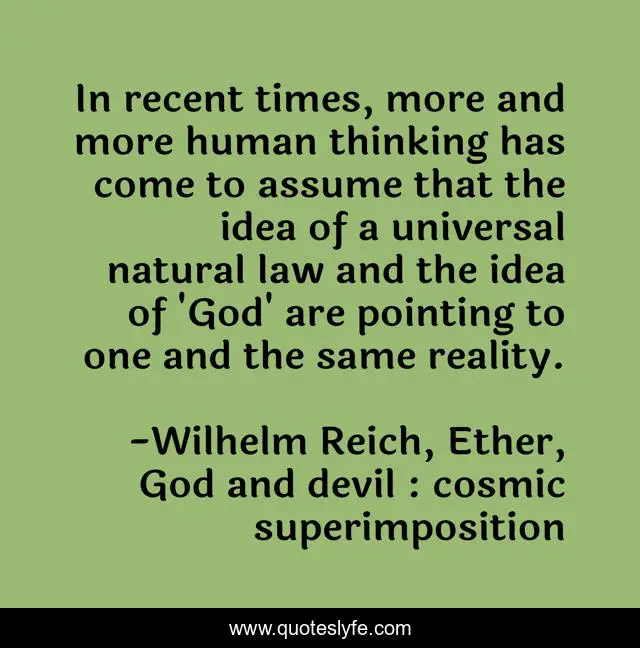 This page presents the quote "In recent times, more and more human thinking has come to assume that the idea of a universal natural law and the idea of 'God' are pointing to one and the same reality.". Author of this quote is Wilhelm Reich, Ether, God and devil : cosmic superimposition. This quote is about cosmic-superimposition, god,.