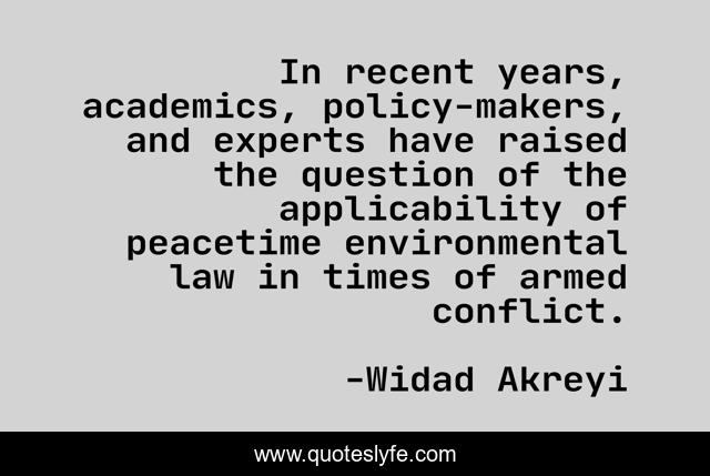 This page presents the quote "In recent years, academics, policy-makers, and experts have raised the question of the applicability of peacetime environmental law in times of armed conflict.". Author of this quote is Widad Akreyi. This quote is about peace, public-health, environmental-protection, accountability, environment, widad-akrawi, conflicts, military, environmental-law,.