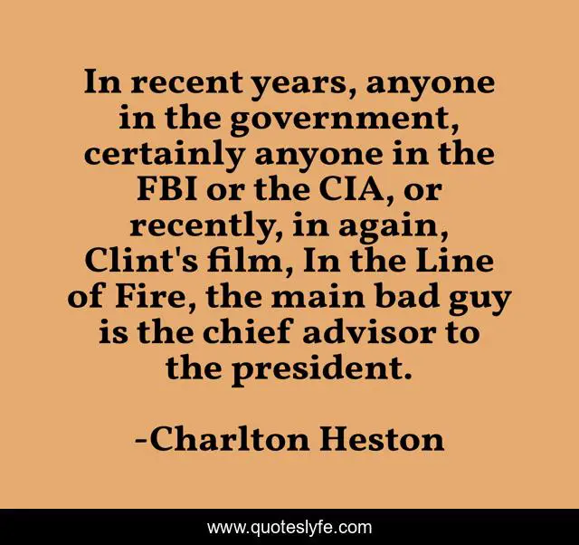 This page presents the quote "In recent years, anyone in the government, certainly anyone in the FBI or the CIA, or recently, in again, Clint's film, In the Line of Fire, the main bad guy is the chief advisor to the president.". Author of this quote is Charlton Heston. This quote is about fire, president, bad,.